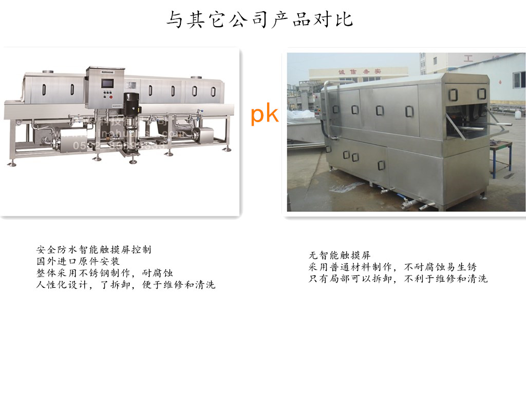 自動洗箱機(jī)預(yù)洗過程是水泵將水從預(yù)洗水箱中吸出,經(jīng)噴嘴噴出,使食品或容器具各面收到清洗,洗掉雜物,清洗后的污水經(jīng)過濾分離流回水箱,雜物排出。洗箱機(jī)成套設(shè)備無菌洗箱機(jī)主清洗過程是水泵將溫水從主清洗水箱中吸出,經(jīng)噴嘴噴出,使食品或容器具各面受到清洗,清洗掉剩余雜物及油污,清洗后的污水經(jīng)過濾分離流回水箱,雜物排出。漂清過程是漂洗水泵將熱水從漂洗水箱中吸出,經(jīng)噴嘴噴出,將被清洗物上的清洗劑等漂洗掉,同時對清洗物進(jìn)行消毒,水流至主清洗水箱。周轉(zhuǎn)箱清洗機(jī)輸送系統(tǒng)采用變頻調(diào)速電機(jī)帶動,調(diào)節(jié)電機(jī)速度以控制清洗時間。洗箱機(jī)成套設(shè)備該機(jī)側(cè)導(dǎo)向機(jī)構(gòu)可調(diào)以,適應(yīng)不同規(guī)格清洗物品。