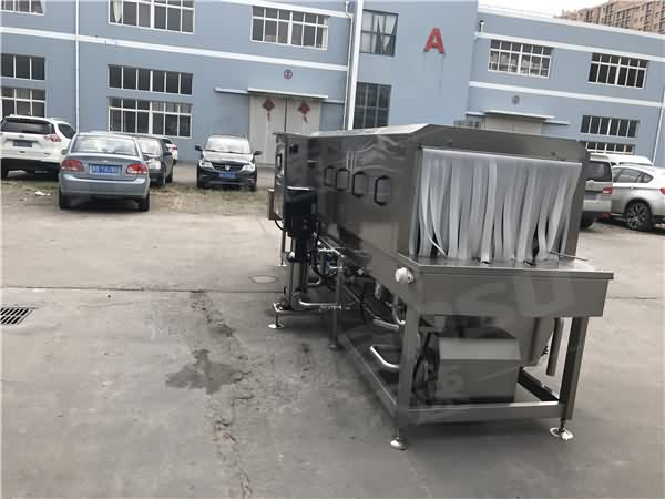 1、通過預洗、高壓水流清洗、漂洗、沖洗等連續(xù)四道清洗,將周轉(zhuǎn)筐充分清洗并消毒: