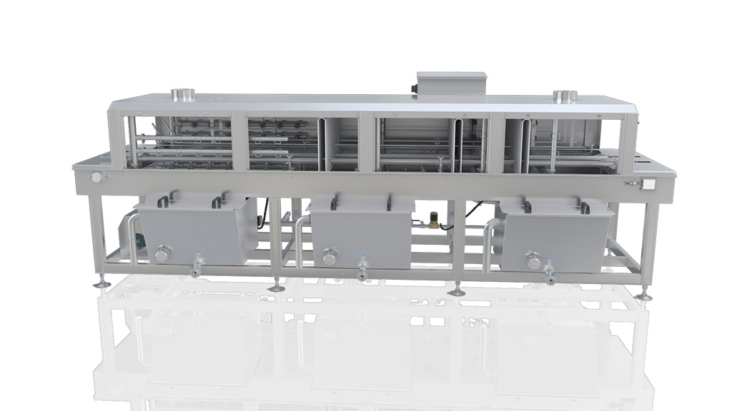 1、熱水循環(huán)洗箱機通過浸泡、高壓噴淋、漂洗、沖洗等連續(xù)四道清洗,將周轉(zhuǎn)筐充分清洗并消毒: