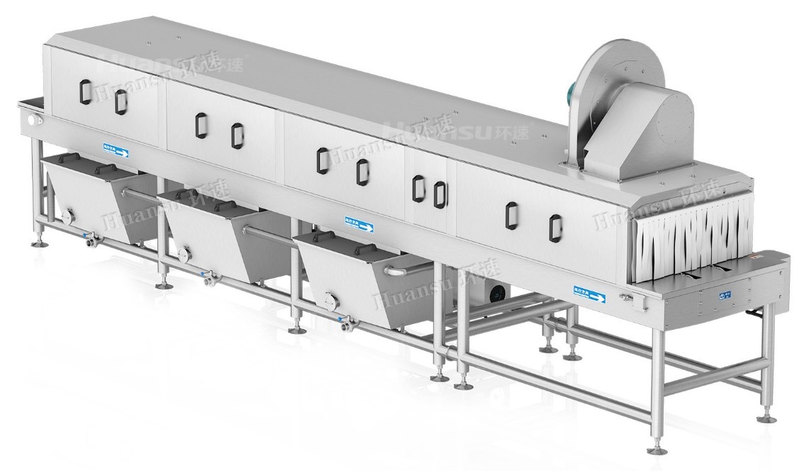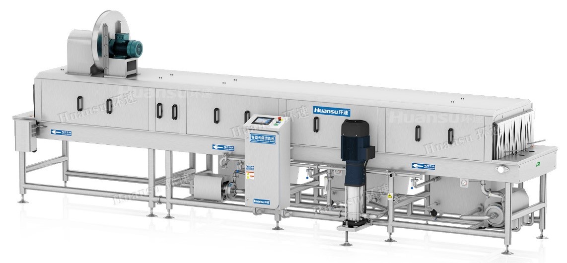 塑料周轉(zhuǎn)筐因有著很多的鏤空與縫隙,存在著很多衛(wèi)生死角,使用人工進(jìn)行清洗,很難對大批量的塑料筐進(jìn)行無死角清洗,因此環(huán)速研發(fā)的塑料筐清洗機(jī)便可省去人工清洗,使用機(jī)械設(shè)備完成大批量周轉(zhuǎn)筐的清洗。塑料筐清洗機(jī)使用80°C以上的高溫水對容器進(jìn)行清洗,通過高壓的方式將污漬與灰塵沖離開容器表面。容器通過輸送鏈送入清洗機(jī)中,先后通過預(yù)洗階段、主洗階段、漂洗階段與凈洗階段,風(fēng)干階段可去除容器表面水分,烘干階段可去除容器殘留水分,對容器進(jìn)行在此消毒滅菌。