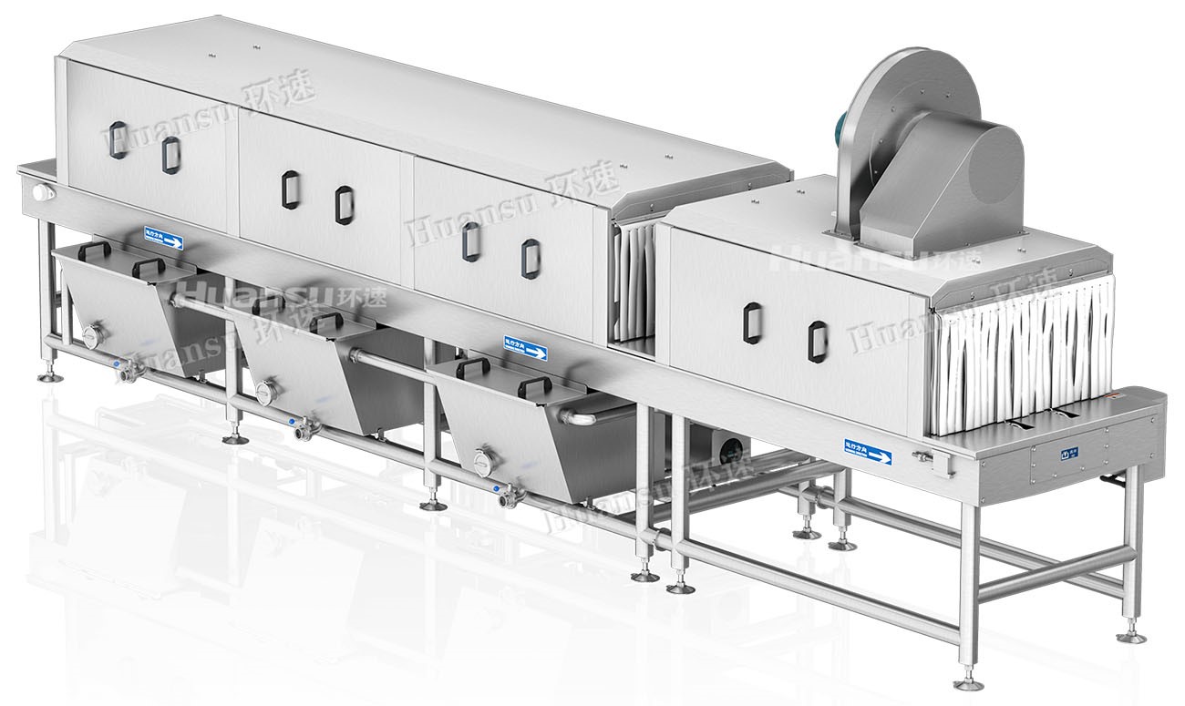 使用三級(jí)水箱與四級(jí)清洗方式將容器的附著物清洗干凈。首先采用大流量清洗,模擬浸泡法將附著物泡脹泡軟,更利于后續(xù)清洗干凈。第二級(jí)采用高壓清洗,將附著物通過高壓的方式將其沖離開容器表面。第三級(jí)采用凈水漂洗,通過使用較為干凈的水將前兩級(jí)殘留的清洗液清洗干凈。第四季采用凈水沖洗,使用沒經(jīng)過循環(huán)的干凈水將殘留污水全部沖洗干凈,同時(shí)也起到了對(duì)高溫清洗后的筐子進(jìn)行降溫的作用。與其他塑料筐清洗機(jī)不同的是,環(huán)速研發(fā)的周轉(zhuǎn)筐清洗機(jī)可加裝風(fēng)干或烘干系統(tǒng),進(jìn)一步提高容器周轉(zhuǎn)效率。