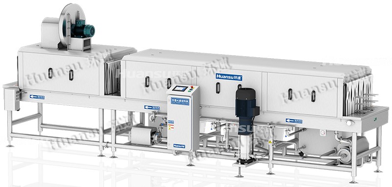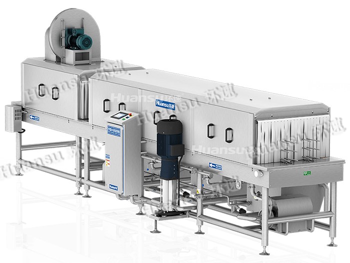環(huán)速通過專有的四級清洗模式來洗掉托盤表面上的附著物。第一級采用大流量清洗,模擬傳統(tǒng)清洗中的浸泡法將附著物泡脹泡軟,方便后續(xù)清洗干凈。第二級采用高壓清洗,將附著物通過高壓的方式?jīng)_離開容器表面實(shí)現(xiàn)污漬洗凈的目的。第三級采用凈水漂洗,使用較為干凈的循環(huán)水沖洗容器表面,將前兩級殘留的清洗劑液沖洗干凈。第四級采用凈水沖洗,使用沒經(jīng)過循環(huán)的干凈水將容器表面的殘留污水全部清洗干凈,同時(shí)也起到對高溫清洗后的容器進(jìn)行降溫的作用。