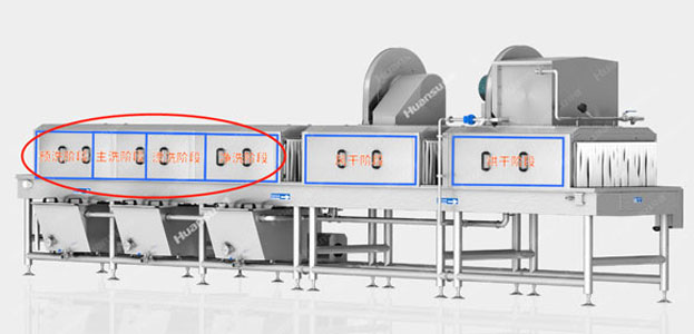 容器滅菌清洗機,采用自行設計研發(fā)的三梯度循環(huán)水箱,利用高溫蒸汽對水箱進行加熱,再通過高壓水泵將熱水泵到高壓噴頭,清洗的同時還能進行巴氏滅菌。具體到清洗過程,總共包括四個環(huán)節(jié),分為預洗、主洗、漂洗、凈洗。預洗是大流量的水洗,達到浸泡作用,可將周轉筐表面的附著物泡脹、泡軟,利于后續(xù)清洗。主洗使用高壓水對周轉筐進行高壓沖洗,將預洗階段泡軟并松動的頑固污漬沖洗下來。漂洗負責將容器上的附著物漂清。凈洗階段使用潔凈的自來水,將殘余的污水沖洗干凈,同時對經(jīng)過高溫滅菌的容器進行降溫。