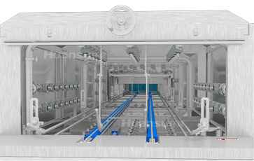 水箱系統(tǒng)是自動(dòng)洗筐機(jī)的一大設(shè)計(jì)亮點(diǎn)。它采用三級(jí)分梯度設(shè)計(jì),集成有加熱、控溫功能,可將水加熱并保持在80℃以上,保證合格的滅菌效果。梯度設(shè)計(jì)的意義在于合理分配水資源,方便構(gòu)建水循環(huán)系統(tǒng)。潔凈水從高向低補(bǔ)充,一級(jí)水箱處在水路末端,為預(yù)洗階段供水。因?yàn)橄冉佑|容器,會(huì)清洗下大量淺表非頑固污濁物,潔凈度相對(duì)最差,而洗脫的油污和其它漂浮異物將隨著二級(jí)水箱源源不斷的供水而溢出并排入下水道,保證一級(jí)水箱的水質(zhì)。二級(jí)水箱為高壓主洗環(huán)節(jié)供水,能去除更頑固的污物,水質(zhì)相較一級(jí)水箱更清潔。三級(jí)水箱為漂洗環(huán)節(jié)供水,水質(zhì)比前兩級(jí)更潔凈,能漂去容器上的附著物與污水。