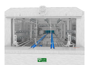 環(huán)速自動(dòng)洗筐機(jī)在設(shè)計(jì)時(shí)注入了很多巧思,是不容易一一分說(shuō)的,正如剛才提過(guò)的水箱,它不只擁有加熱、保溫的功能,還有合理分配水資源、過(guò)濾凈化水質(zhì)的功能,不僅省水,還能減少排污量,吃的是草,擠出的是茅臺(tái),堪稱(chēng)勞模。具體來(lái)講,水箱系統(tǒng)采用三個(gè)水箱串聯(lián)的形式,由管路連通,并存在一定的高低梯度,可確保水從高到低沿梯度流動(dòng)。如果是一個(gè)單獨(dú)的水箱,污物集中在一處,水會(huì)越洗越臟,影響后面的清洗質(zhì)量。拆分成三個(gè)水箱,讓其分別為一個(gè)清洗工序供水,清洗后的水重新回到水箱。隨著外接管路源源不斷地供水,水箱的水會(huì)自動(dòng)向下級(jí)水箱溢流,起到稀釋水中污染物的作用;位于末端的水箱持續(xù)溢流排污,將漂浮的油脂類(lèi)污物排出。三級(jí)水箱的設(shè)計(jì),將水劃分出不同潔凈度等級(jí),用臟水洗臟筐、凈水洗凈筐,這種專(zhuān)水專(zhuān)用的模工工,可以大幅節(jié)約水資源,減少排污量。