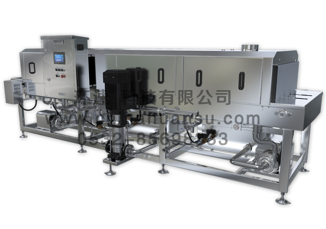 環(huán)速隧道式清洗機(jī)XK-300周轉(zhuǎn)箱洗箱機(jī)應(yīng)用于食品或容器具的清洗和消毒設(shè)備。食品、容器具等待清洗器具從洗箱機(jī)輸入端進(jìn)入清洗隧道,經(jīng)過預(yù)洗、主清洗、漂洗、最后輸出,完成清洗過程。周轉(zhuǎn)箱洗箱機(jī)主要用于屠宰、肉類、水產(chǎn)、蔬果、飲料、釀造等食品加工廠或食品物流中心、配送中心等,周轉(zhuǎn)箱洗箱機(jī)也適用于各種周轉(zhuǎn)筐、盤、箱、托盤、等容器具的清洗和消毒??晒?jié)省用水量達(dá)70%,可比古老的人工清洗方法能節(jié)省人力7-8人。